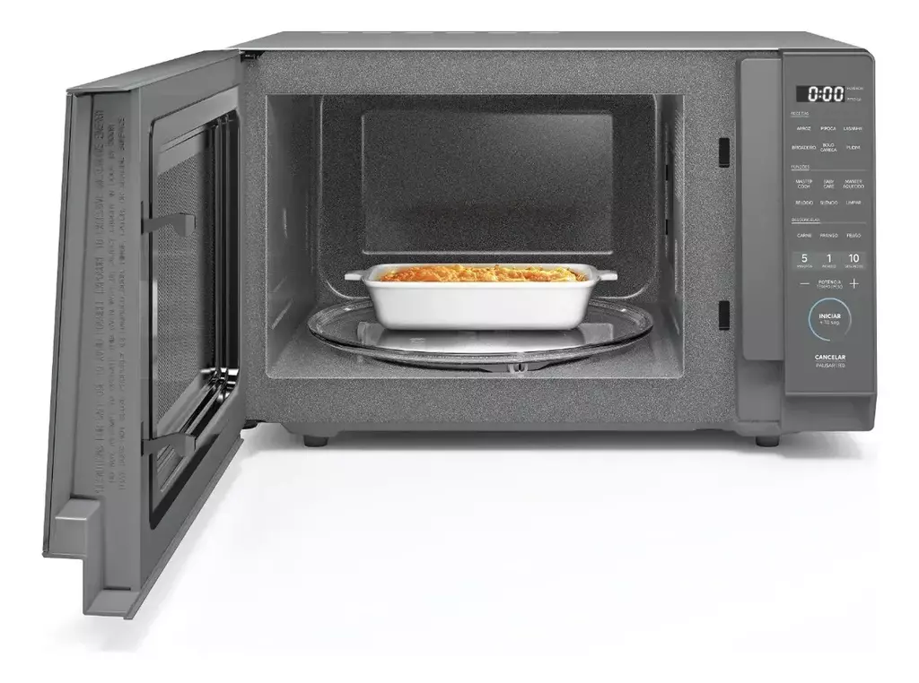 Funções: Relógio, Trava de segurança, Descongelar por peso, Limpa Fácil, Receitas automáticas, Toque rápido